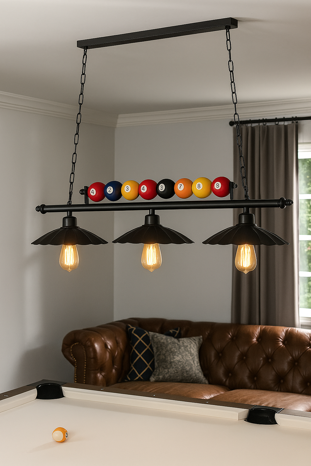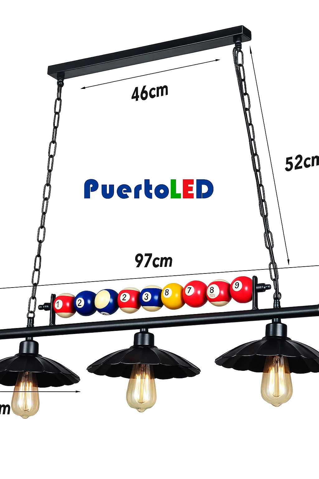 Ilumina tu espacio con estilo único y personalidad. Nuestra lámpara colgante de billar combina diseño industrial con un toque divertido gracias a su detalle decorativo de bolas de pool. Fabricada en metal negro de alta resistencia, cuenta con tres pantallas tipo campana y portalámparas E27 compatibles con ampolletas LED estilo vintage Edison. Ideal para mesas de billar, salas de juegos, bares o espacios con decoración retro-industrial, esta lámpara no solo aporta luz cálida y agradable, sino también un elemento decorativo llamativo que será el centro de todas las miradas.