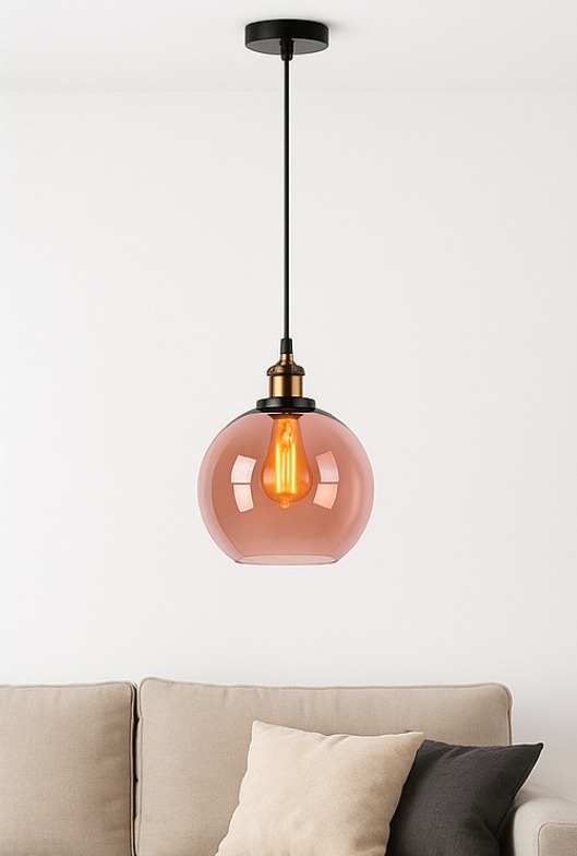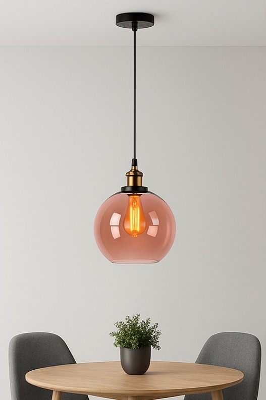 Ilumina tus espacios con estilo y elegancia gracias a esta lámpara colgante de diseño esférico. Su pantalla de vidrio soplado en tono ámbar-rosado crea un efecto cálido y acogedor, ideal para realzar la decoración de comedores, salas, cocinas, bares o cafeterías. El diseño minimalista con acabado metálico en negro y detalles en latón combina a la perfección con estilos modernos, industriales o vintage. Además, su cable regulable te permite ajustar la altura para adaptarse a cualquier ambiente.