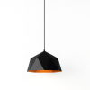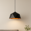 Esta lampara colgante de forma poligonal, se destaca por su diseño simétrico. su acabado exterior negro mate contraste con su interior dorado cálido, generando una luz acogedora ideal para ambientes con estilos.