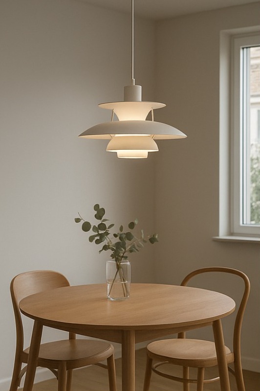 Dale un toque elegante y minimalista a tus espacios con esta lámpara colgante de diseño moderno. Su estructura metálica en acabado blanco mate, combinada con aros decorativos cromados, ofrece un estilo sofisticado que se adapta perfectamente a comedores, salas, cocinas u oficinas. Gracias a su pantalla en capas, la luz se distribuye de manera uniforme y sin deslumbramientos, creando un ambiente cálido y confortable. Además, cuenta con cable regulable que permite ajustar la altura según tus necesidades.