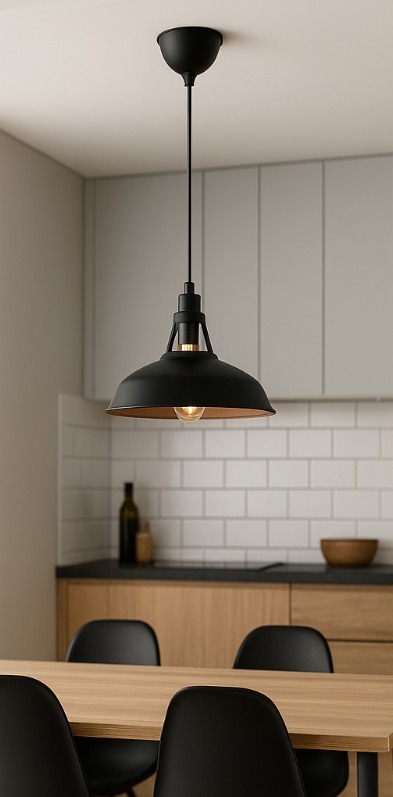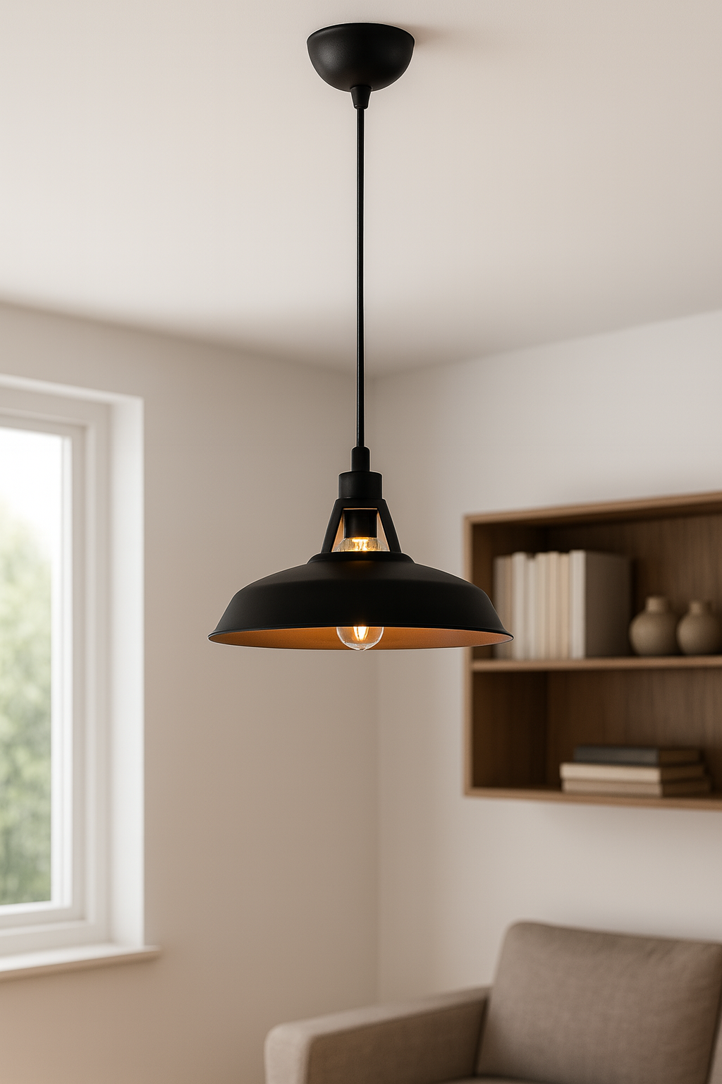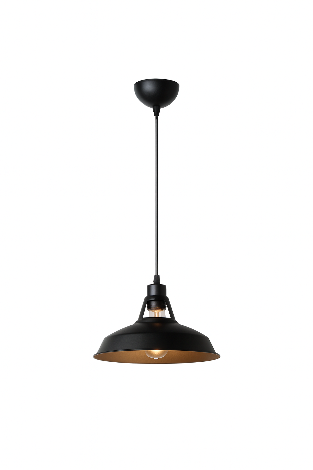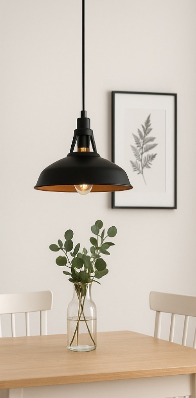 Dale a tus espacios un estilo moderno con esta lámpara colgante de diseño industrial. Su pantalla metálica en acabado negro mate y el interior dorado generan un contraste elegante que aporta calidez y carácter a cualquier ambiente. Ideal para instalar sobre mesas de comedor, islas de cocina, salas de estar o bares, combina estética y funcionalidad en un solo producto. Gracias a su cable regulable, puedes ajustar la altura de instalación para adaptarse a tus necesidades. Además, es compatible con bombillas LED E27, lo que permite reducir el consumo energético y personalizar la iluminación con diferentes temperaturas de color o bombillas decorativas tipo Edison.