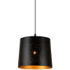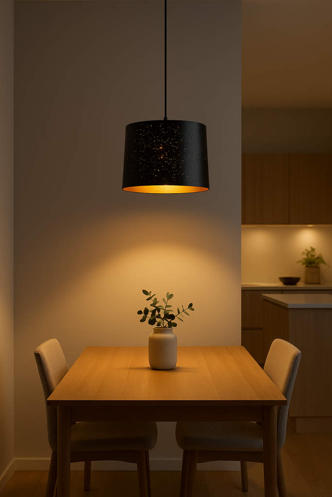 Colgante de diseño contemporáneo con pantalla metálica cilíndrica y acabado negro mate exterior / dorado interior. El troquelado perimetral crea un efecto estrellado que deja escapar destellos cálidos, mientras el interior dorado potencia la reflexión de la luz hacia abajo, ideal para iluminar mesas, barras o rincones decorativos sin deslumbrar. Compatible con ampolleta E27 (recomendado LED filamento) y altura regulable para una instalación proporcionada en cualquier ambiente.